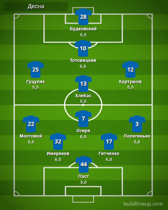 «Десна»: Паст – Мостовой, Имереков, Гитченко, Полегенько (Мудрик, 67) – Огиря – Картушов (Шевцов, 81), Хлебас (Дегтярев, 67),Гуцуляк – Тотовицкий (Арвеладзе, 56) – Будковский.