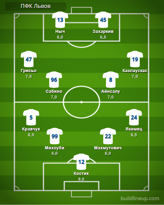 «ПФК Львов»: Костик – Кравчук, Михоуби, Махмутович, Якимец – Грисьо, Сабино, Айнсалу, Казлаускас (Клименчук, 79) – Ныч (Ременяк, 90+3), Захаркив (Романчук, 54).